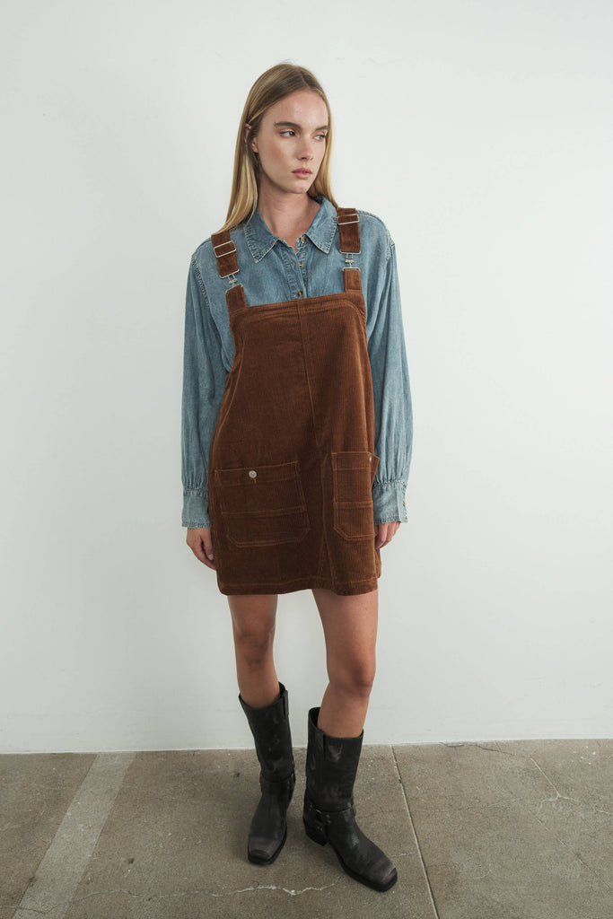 This overall-inspired version featured in a staple corduroy fabrication with defined shoulder straps and front pockets for dimension. It's fit is shapeless, and relaxed. Featuring a square neckline, adjustable shoulder straps, front pockets, longline style